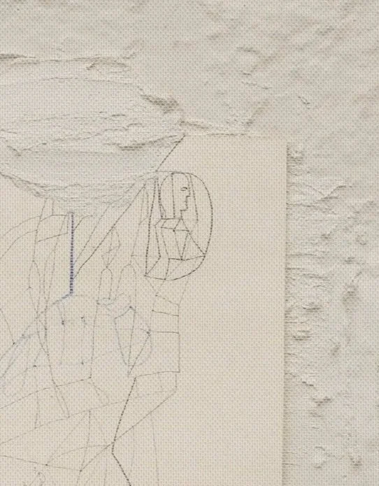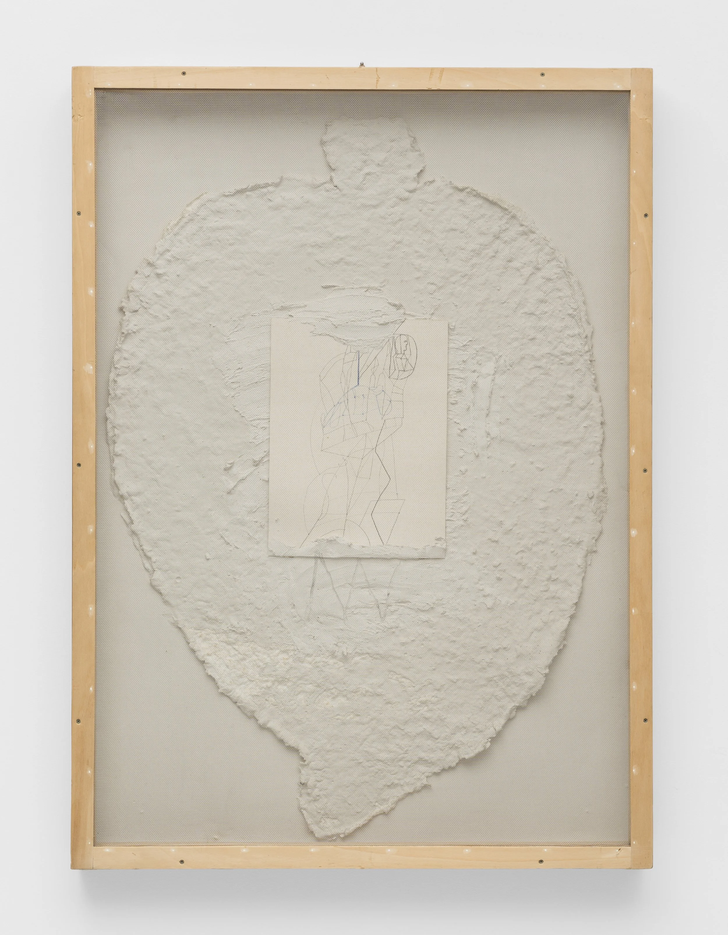 Cartone, gesso, collage, tecnica mista, cornice in legno e zanzariera